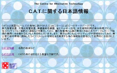 しかし、国際AI財団の都合により、1998年末以降しばらくの間サーバーメンテナンスが行われない事となりました(その後、同財団は国際IT財団に改組しました)。そこで、1999年初夏より「ビオシティ」のウェブサイトにCAT関連のコンテンツを移転する事になりました。「ビオシティ」は都市と自然の未来マガジンを標榜する季刊誌であり、日本で最初にCATを紹介したメディアとしても知られています。この移転に伴い、それまでの仮設的なものから、CATのオリジナル英語版ウェブページの完全日本語版を目指す事としました。